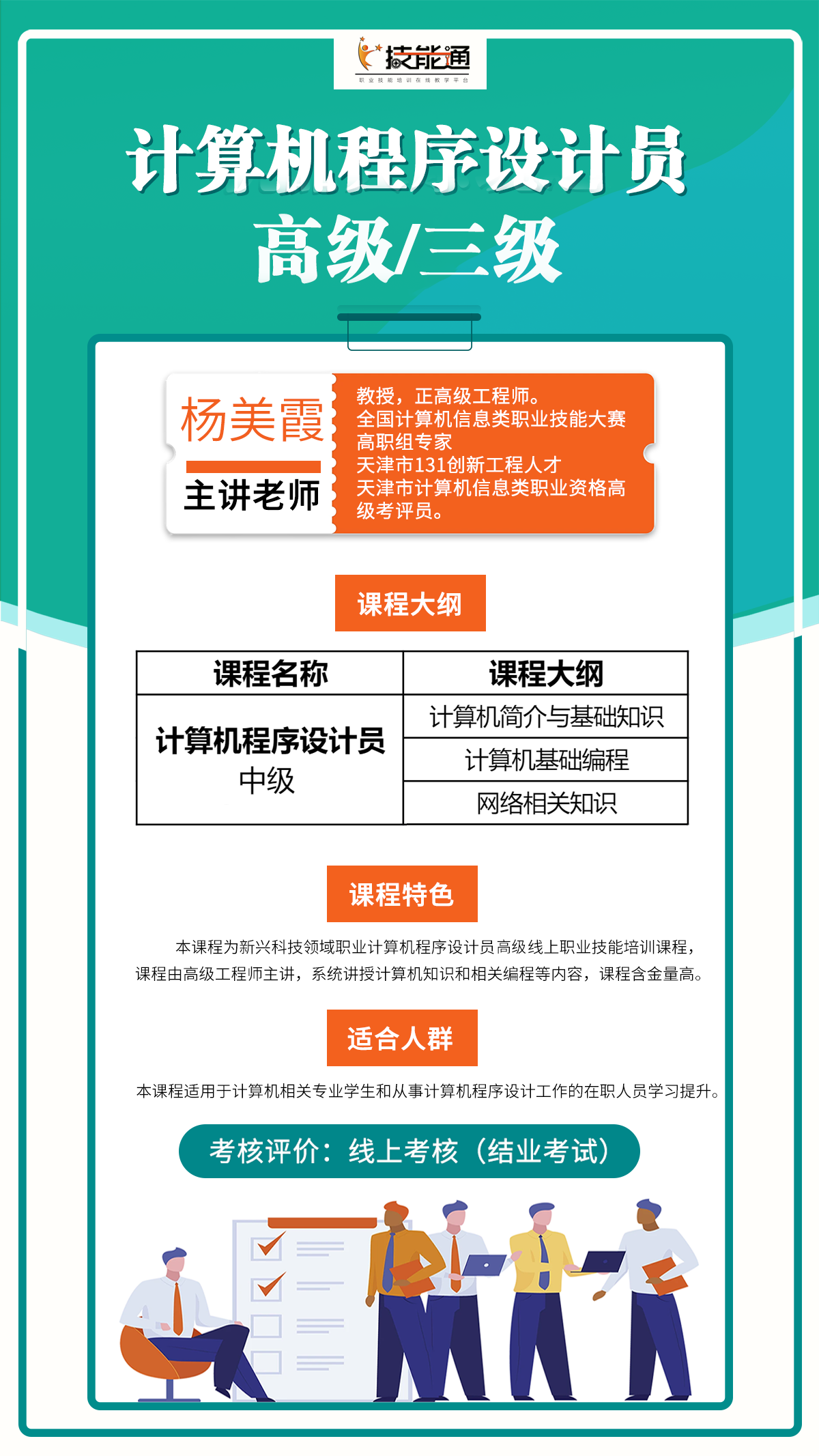 《计算机程序设计员(高级)》总计22学时,适用于计算机相关专业学生和从事计算机程序设计工作的在职人员学习提升,主要学习内容包括通识课程与计算机相关知识、计算机操作系统、网络编程基础知识、数据库及工程。