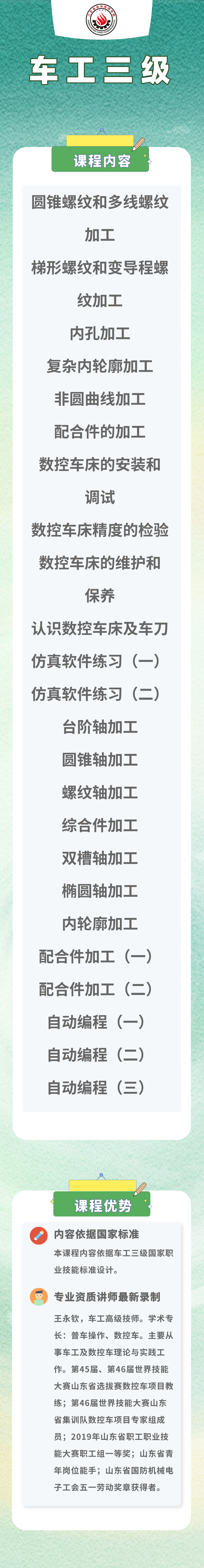 本课程共计24课时,主要内容包括:螺纹加工及配合件的工艺分析等车工相关内容。