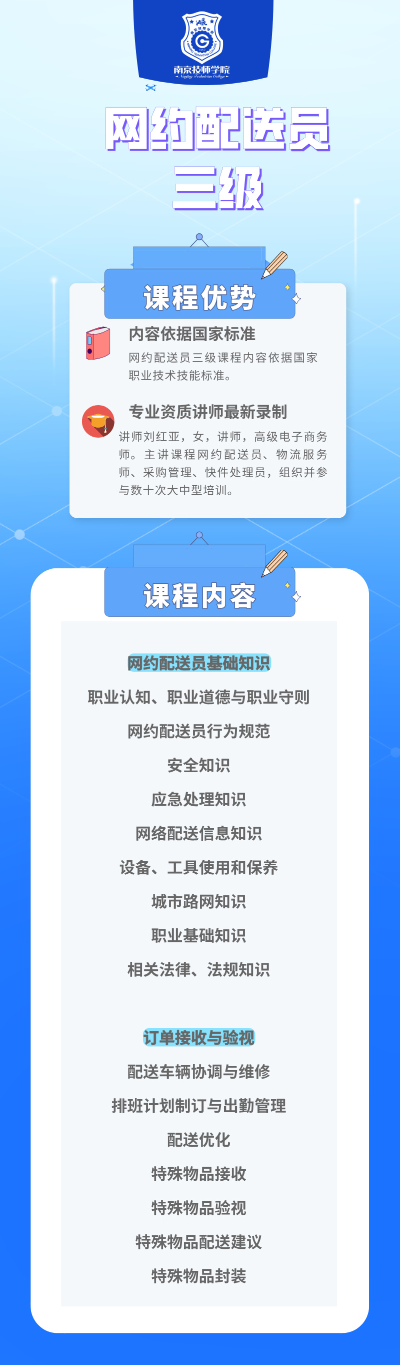 本课程共计16课时。适用学习对象:从事网约配送服务人员。主要学习内容为:网约配送工作应该掌握的法律法规以及安全生产知识、订单接收与验视等知识点。