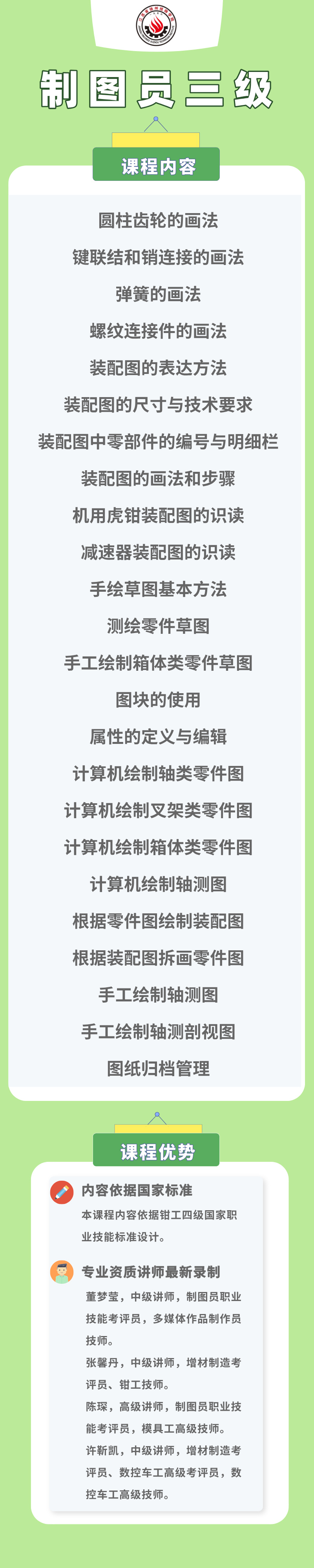 本课程共计27.7课时,主要学习内容为:变换投影面、绘制两回转体轴线垂直交叉相贯线、测量工具的使用、绘制专业示意图、图块制作和调用、图库的使用、属性修改、手工绘制轴测图、手工绘制轴测剖视图、专业图档管理的基本知识等知识点。
